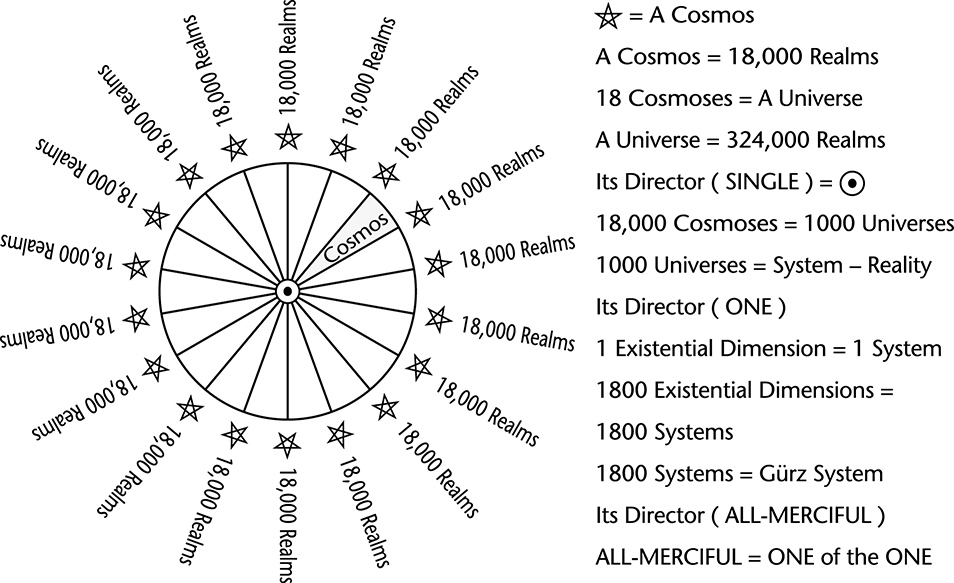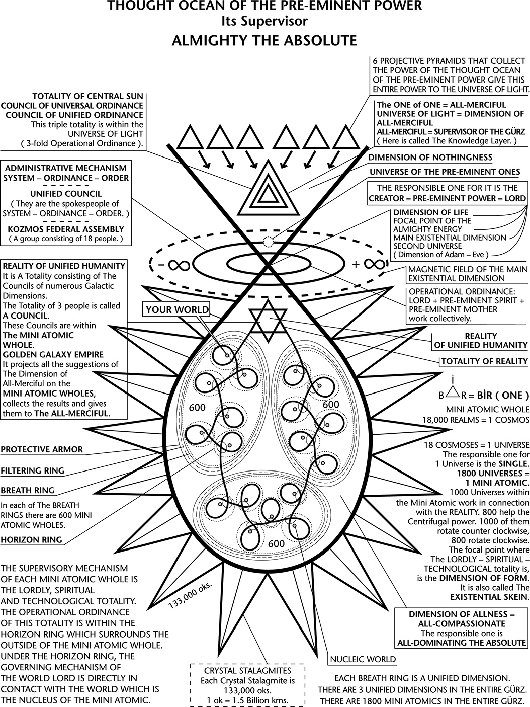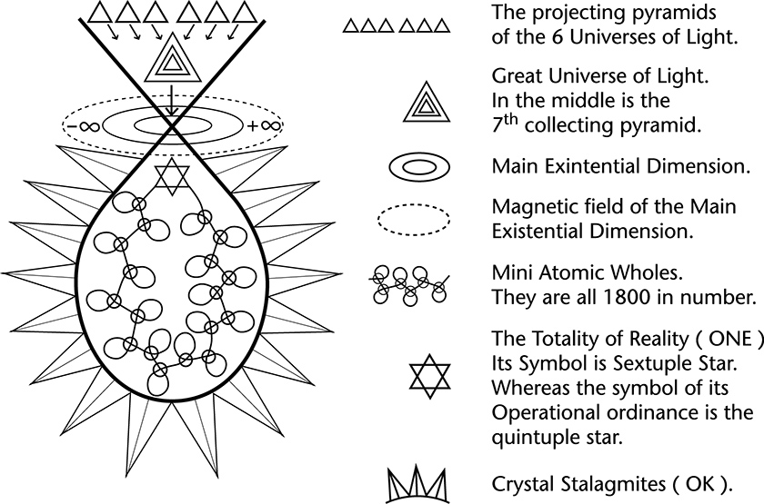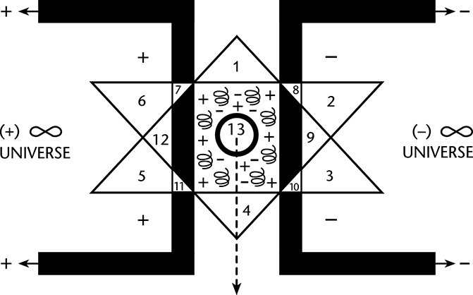 In the above diagram, the two Opposite Universes, by separating the Energies of the Mighty Focal Point, constitute the Atomic Whole and create the Positive Infinite Universe and the Negative Infinite Universe.